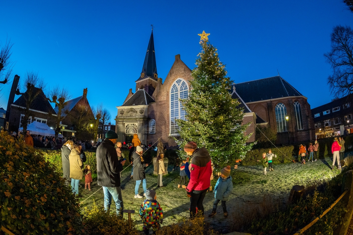 De week voorafgaand aan dit feestelijke evenement staat de imposante kerstboom al voor de Oude Kerk in de Herenstraat. Een toegewijd team van vrijwilligers verzorgt de versiering van de boom, waarbij zelfs een hoogwerker nodig is om de hoogste takken te bereiken. Op de dag zelf staat de boom er prachtig bij.